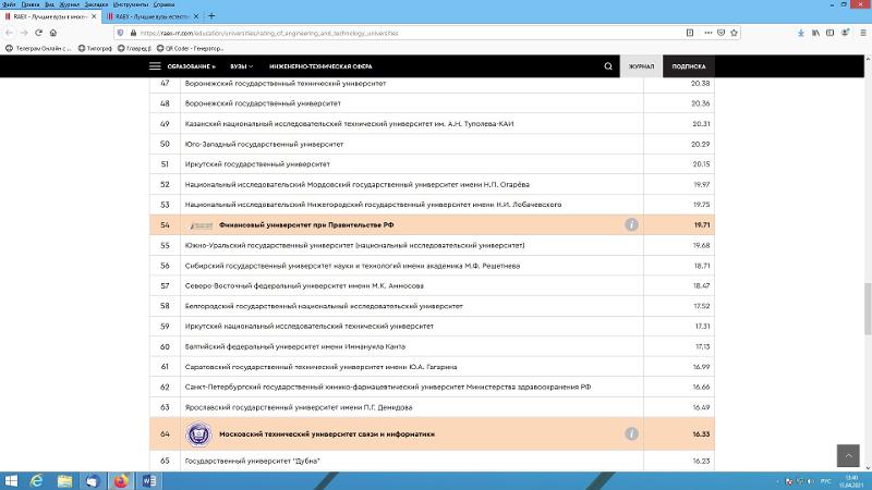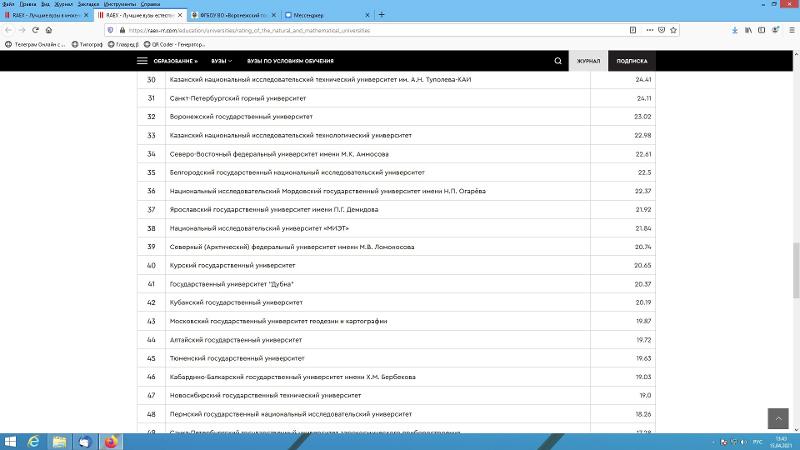 15 апреля рейтинговое агентство RAEX опубликовало списки лучших вузов России в естественно-математической и инженерно-технической сферах. ВГУ занял 32-ю позицию в естественно-математической сфере и 48-ю – в инженерно-технической.