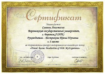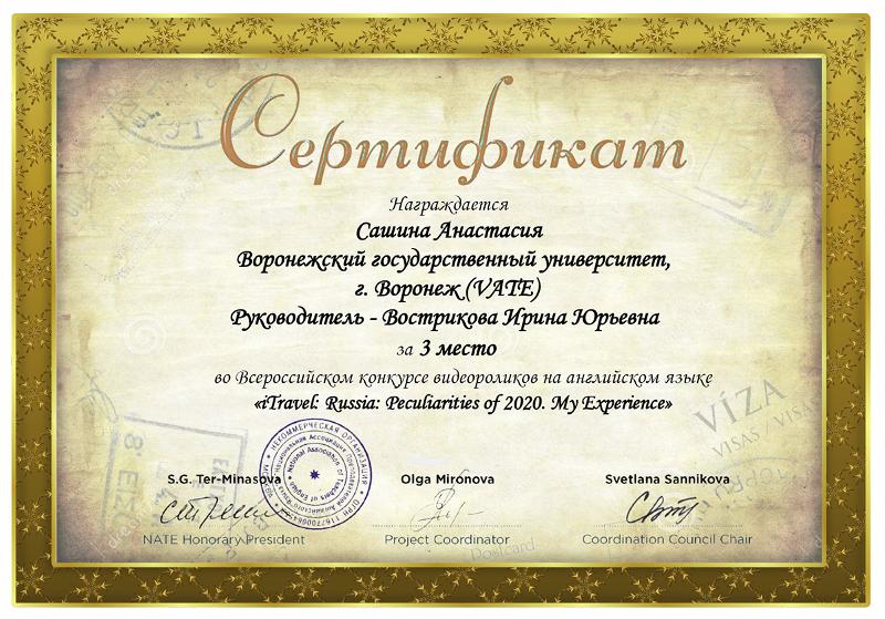 Национальная Ассоциация преподавателей английского языка подвела итоги Всероссийского конкурса видеороликов на английском языке «iTravel: Russia. Peculiarities of 2020. My Experience». Третье место в конкурсе заняла Анастасия Сашина, студентка 1 курса факультета компьютерных наук (преподаватель – доцент Ирина Вострикова).