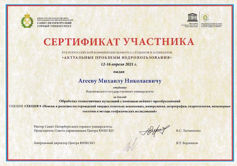 Студент 4 курса геологического факультета ВГУ Михаил Агеев принял участие в XIX Всероссийском форуме-конкурсе студентов и аспирантов «Актуальные проблемы недропользования». Российский отборочный этап форума-конкурса проходил с 12 по 16 апреля на базе Санкт-Петербургского горного университета.