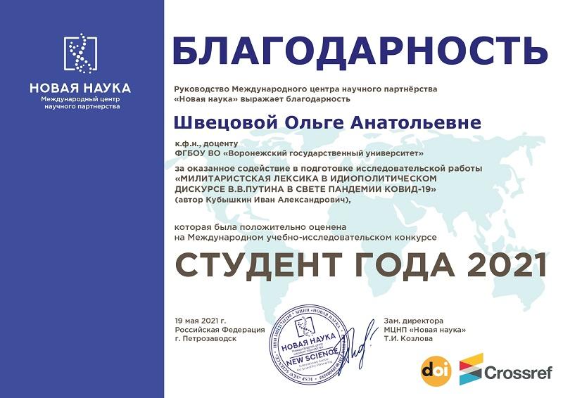 Победу филологу принесла статья «Милитаристская лексика в идиополитическом дискурсе В.В. Путина в свете пандемии КОВИД-19». Научный руководитель Ивана Кубышкина, доцент кафедры русского языка Ольга Швецова получила благодарность от имени руководства «Новой науки» за содействие в подготовке исследовательской работы.