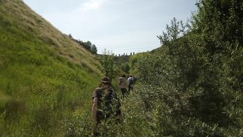 На следующий день после наших туристических подвигов все три бригады стояли на месте сбора. В этот раз нам предстояло идти к другому оврагу – под названием «Больничный». Свернув в уже знакомый «Юбилейный», пройдя по аллее, мы сошли с неё и двинули на юг, вдоль правого берега реки Дон. Стоит заметить, что солнце было агрессивнее, чем вчера, что нас очень смущало и мы, в надежде на то, что остановка будет находиться где-нибудь в лесу под деревьями, прошли около километра. Зайдя в лес, мы подошли к нашему следующему оврагу, здесь же отметили «Т.Н. 2» и принялись описывать так называемые «закопушки» (небольшая ямка, которая служит для вскрытия горных пород). В пикетажках значилась запись «В левом борту оврага «Больничный» наблюдаем закопушки, частично поросшие растительностью. Размер 50x40 см». Описав каждую из четырёх и отобрав образцы, наша бригада прослушала лекцию о склоновых процессах. На этом этапе каждый из нас надеялся, что второй день окончен, но нам предстояло выйти из-под тени деревьев и двинуть по обратному пути на следующую точку наблюдения для того, чтобы описать те самые склоновые процессы, лекцию о которых мы прослушали. К счастью, долго мы там не пробыли.