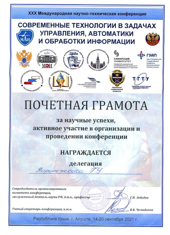 С 14 по 20 сентября в оздоровительно-учебном центре «Алушта» (республика Крым) Московского авиационного института прошла юбилейная, ХXX Международная научно-техническая конференция «Современные технологии в задачах управления, автоматики и обработки информации». В мероприятии приняла участие делегация из Воронежа, в которую вошли и представители Воронежского государственного Университета.
