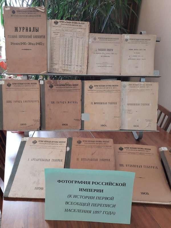 Результаты переписи были опубликованы в 89-ти томах (119 книг) под общим заглавием «Первая всеобщая перепись населения Российской империи 1897 года». В отделе редких книг хранятся 83 экземпляра книг этой тематики. Также на выставке представлены статистические данные Архангельской, Бессарабской, Воронежской, Орловской губерний, Санкт-Петербурга, Москвы и других.