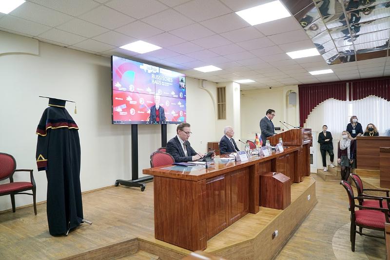 В условиях пандемийных ограничений церемония вручения профессорской мантии и знака «За заслуги перед ВГУ» впервые прошла в онлайн-режиме – господин Айхведе участвовал в церемонии, наблюдая за ней из Российского дома науки и культуры в Берлине.