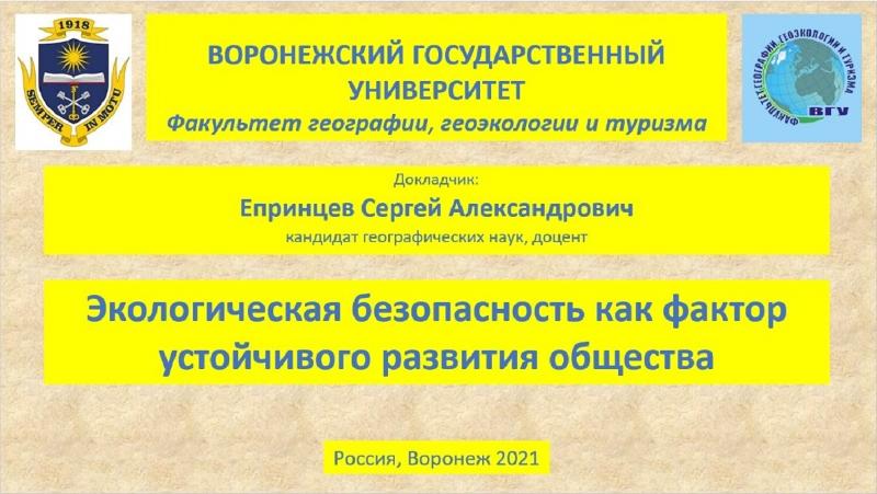 По приглашению донецких коллег на пленарном заседании конференции выступил доцент факультета географии, геоэкологии и туризма ВГУ Сергей Епринцев с докладом на тему «Экологическая безопасность как фактор устойчивого развития общества». Сергей рассказал о научных разработках воронежских географов, осуществляемых при поддержке Российского научного фонда (проект 20-17-00172 «Урбоэкодиагностика состояния воздушной среды крупных промышленных городов Центрального Черноземья: воздействие шумового фактора, канцерогенные риски и обеспечение экологической безопасности») и Российского фонда фундаментальных исследований (проект 19-05-00660 «Разработка модели оптимизации социально-экологических условий для населения крупных городов»).