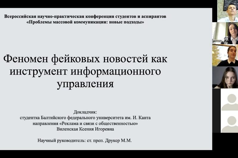 - Ксения Виленская из Балтийского федерального университета имени Канта на тему «Феномен фейковых новостей как инструмента информационного управления» (научный руководитель – старший преподаватель Друкер М.М.);
