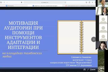 - Елизавета Семенова из Тамбовского государственного университета имени Державина на тему «Мотивация аудитории при помощи инструментов адаптации и интеграции на площадках тамбовских медиа» (научный руководитель – д.ф.н., проф. Зверева Е.А.);