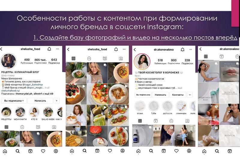 - Евгения Гринберг из Воронежского государственного университета на тему «Особенности работы с контентом при формировании личного бренда в соцсети Instagram» (научный руководитель – к.ф.н., доц. Щукина Л.С.).