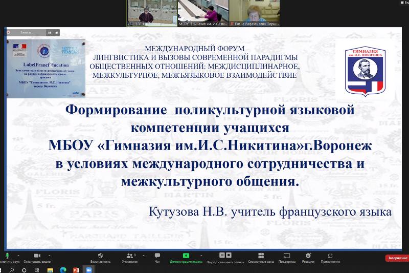 В рамках платформы проходили интересные интерактивные мероприятия. Так, большой интерес вызвал круглый стол «Диалог Россия-Франция: опыт международного сотрудничества в сфере среднего образования». Участники конференции познакомились с уникальным опытом Ассоциированной школой ЮНЕСКО, МБОУ гимназии имени И.С. Никитина с углубленным преподаванием французского языка (Воронеж). Директор гимназии Каверина Ж.И., учителя и ученики гимназии продемонстрировали разнообразные формы участия в международной деятельности: двуязычное франко-российское отделение под эгидой Французского института, программы UNESCO, школьный музей, международные экзамены DELF/DALF, творческие мероприятия с лицеем города Лилля (Франция). Большая часть международного сотрудничества гимназии осуществляется в рамках трехстороннего сотрудничества с Французским институтом (посольство Франции в РФ) и ВГУ.