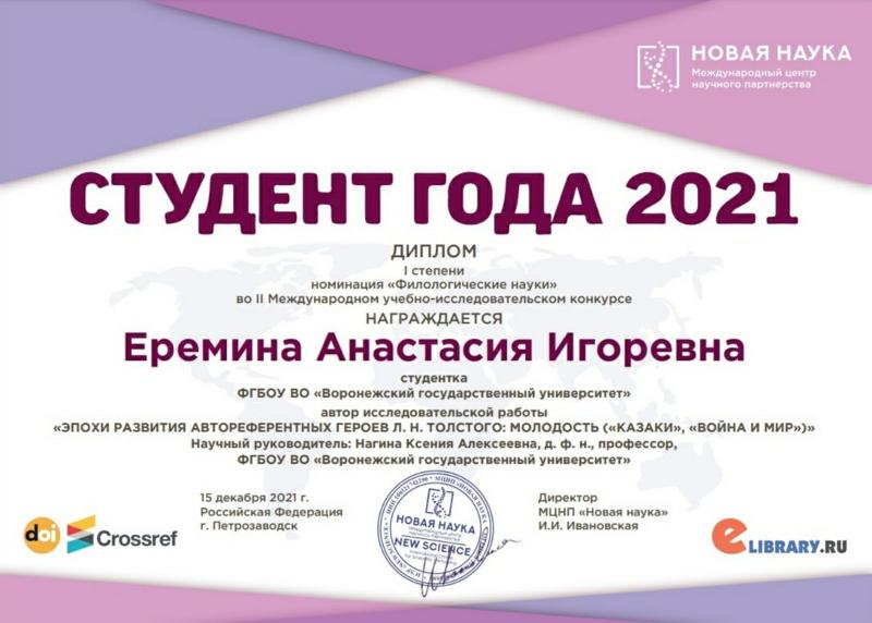 Анастасия Ерёмина выиграла с исследованием «Эпохи развития автореферентных героев Л.Н. Толстого: молодость («Казаки», «Война и мир»)».