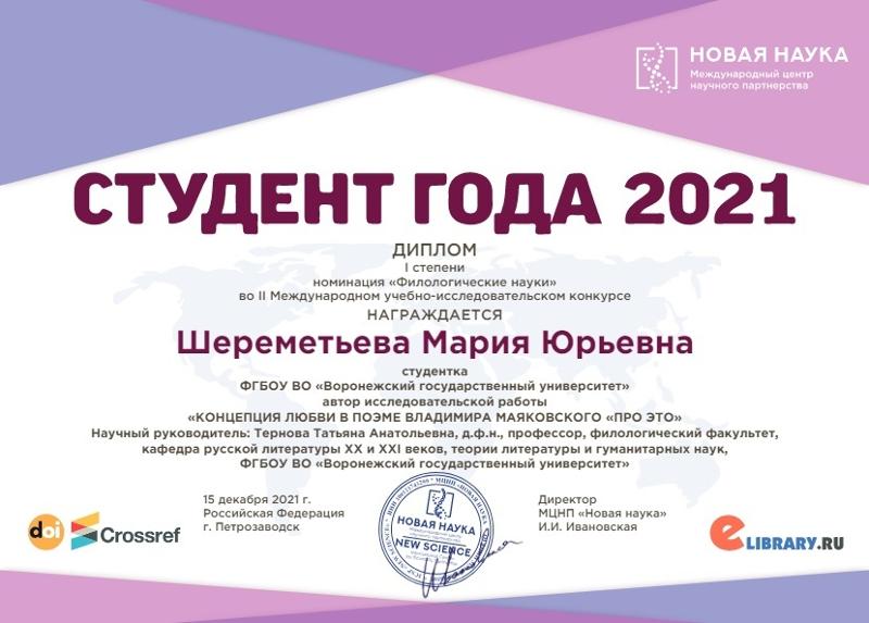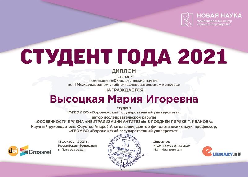 Мария Высоцкая победила с работой «Особенности приёма «Нейтрализация антитезы» в поздней лирике Г. Иванова».