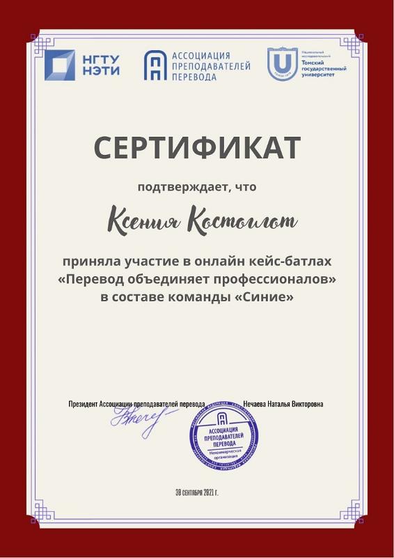 - команду студентов – Ксению Костоглот, Валерия Кадацкого, Алину Прибыткову, Анастасию Посохову, Елену Столярову – победителей переводческого кейс-батла «Перевод объединяет профессионалов»;