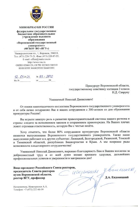 Воронежский государственный университет поздравляет прокурора Воронежской области, государственного советника юстиции 3 класса Николая Савруна с 300-летием российской прокуратуры.