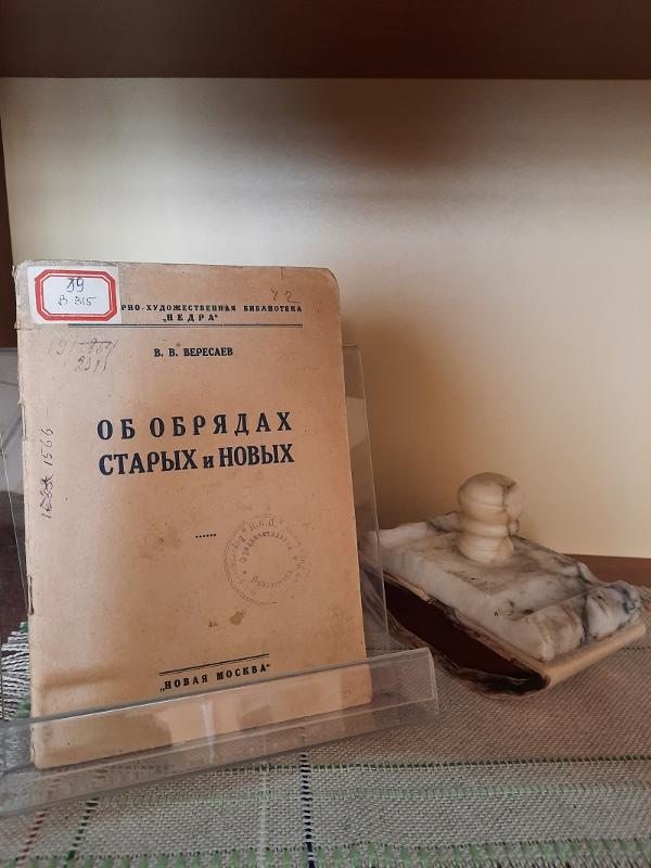 В 1926 году Вересаев написал книгу «Об обрядах старых и новых», в которой рассуждал об уходе из повседневной жизни молодой Советской России церковных обрядов. Позднее эта работа была изъята из библиотек, поскольку в ней автор резко критиковал новые советские обряды, совершаемые при рождении ребёнка, праздновании именин («октябрин»), свадеб и т.д. В.В. Вересаев известен как переводчик Гомера. На выставке представлена книга «Гомеровы гимны» (1926) в переводе с древнегреческого.