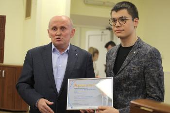Генеральный директор ЗАО «Информсвязь-Черноземье», председатель Общественного Совета ФКН ВГУ Борис Даньшин вручил диплом победителя конкурса стипендии им. Э. К. Алгазинова студенту факультета компьютерных наук Льву Хакимову. Также победителем стипендиального конкурса стала студентка ФКН Маргарита Мотенко. Стипендия учреждена в прошлом году в память декана ФКН Эдуарда Константиновича Алгазинова, ушедшего из жизни в декабре 2020 года, и рассчитана на талантливых студентов ФКН, активных в сфере информационных технологий и программирования.