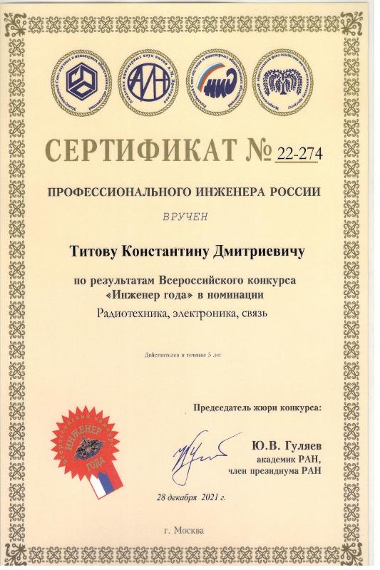 – Было честью победить в областном этапе конкурса и представлять инженерное сообщество Воронежской области на всероссийском этапе. Несмотря на крайне высокий уровень участников конкурса, результаты научной деятельности за последние годы позволили мне стать лауреатом конкурса в профильной номинации. Полученный сертификат «Профессионального инженера России» подвёл некий итог научной и инженерной деятельности в рамках номинации «Инженерное искусство молодых»; следующий этап – номинация «Профессиональные инженеры», где придётся конкурировать с заслуженными изобретателями и учёными с мировым признанием, – поделился Константин Титов.