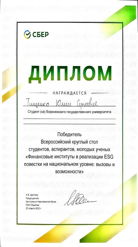 По результатам голосования на трёх площадках победителем была признана студентка 2-го курса экономического факультета ВГУ Юлия Тищенко, выступившая с докладом «Роль ESG банкинга в спасении планеты и его развитие в РФ». Лучшим дискуссантом на площадке Воронежа стала студентка 4-го курса экономического факультета Ксения Подгорная.