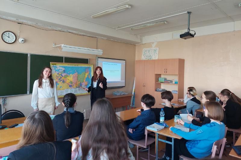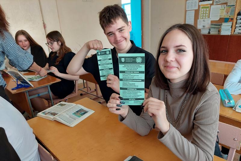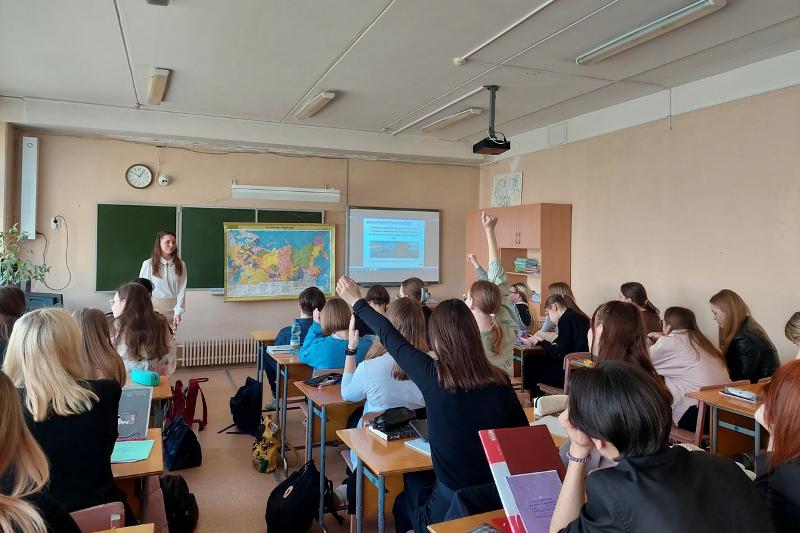 Кроме того, для учеников девятых и десятых классов доцент кафедры физической географии и оптимизации ландшафта ВГУ Евгения Жигулина рассказала о работе приёмной кампании в вузе в 2022 году и об основных направлениях, реализуемых на факультете географии, геоэкологии и туризма.