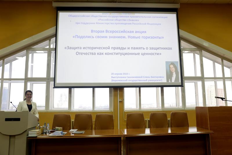 28 апреля в актовом зале юридического факультета ВГУ в рамках Второй Всероссийской акции «Поделись своим знанием. Новые горизонты», проводимой под эгидой Российского общества «Знание», состоялось выступление перед студенческой аудиторией доктора юридических наук, доцента Елены Сазонниковой. Она выступила с докладом «Защита исторической правды и память о защитниках Отечества как конституционные ценности».