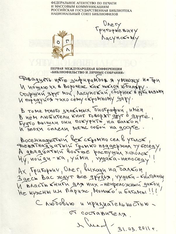 Учёный секретарь Совета ректоров вузов Воронежской области Владимир Листенгартен зачитал приветствие участникам и гостям книговедческих чтений от ректора ВГУ профессора Дмитрия Ендовицкого, который, отдавая должное щедрости дарений О.Г. Ласунского родному университету, выразил благодарность за огромную научную и просветительскую работу.