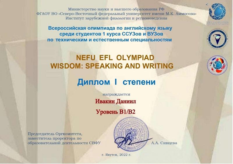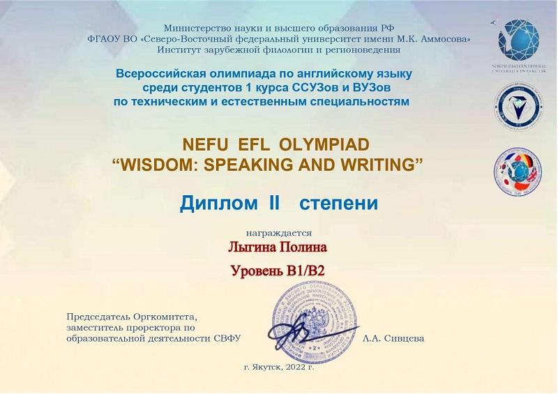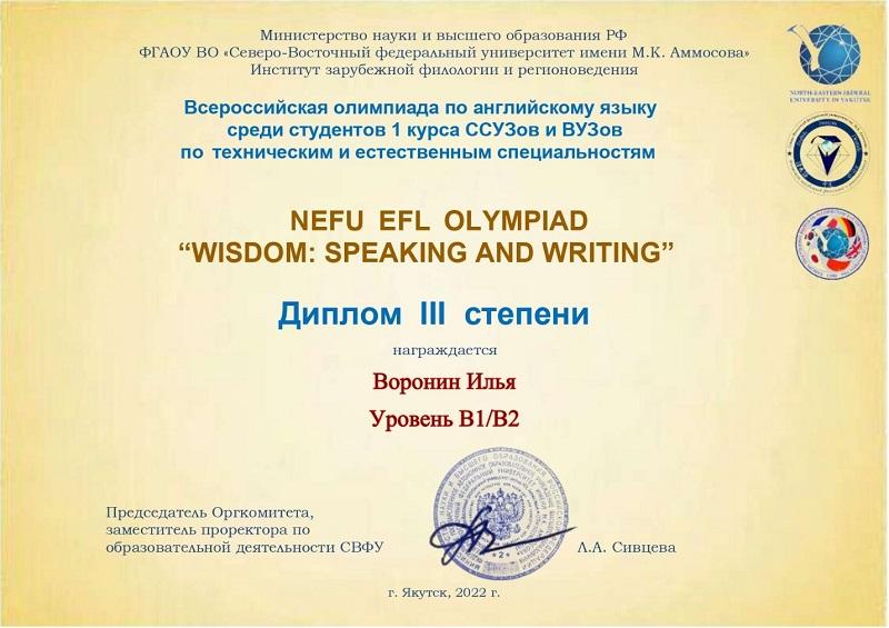 Студенты первого курса ВГУ вошли в число победителей Всероссийской олимпиады по английскому языку среди технических и естественных специальностей NEFU EFL OLYMPIAD «WISDOM: Speaking and Writing». Олимпиада проводилась Северо-Восточным федеральным университетом имени Аммосова (Якутск) в дистанционном формате.