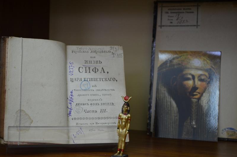 Но интерес к изучению Египта возник гораздо раньше. На выставке «Колыбель цивилизации» представлен экземпляр книги XVIII века – труд французского филолога Жана Террассона (1670–1750) «Геройская добродетель, или жизнь Сифа, царя египетского, из таинственных свидетельств Древнего Египта взятая / Перевёл Денис Фон Визин» (Ч. III, 1764).