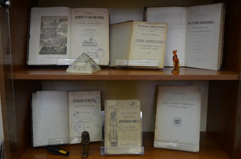 Особое значение имеют труды Б.А. Тураева (1868–1920) – историка, создателя отечественной школы истории Древнего Востока (в частности, Древнего Египта). На выставке представлена его книга «Рассказ египтянина Синухета и образцы египетских документальных автобиографий», вышедшая в Москве в 1915 году. Это живой литературный памятник, показывающий и внутренние переживания египтянина Синухета, и внешние события его жизни, и бытовые картины.