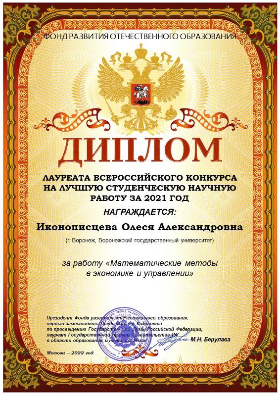 Высокую награду учащейся принесла ее работа по теме «Математические методы в экономике и управлении». Конкурсный материал был разработан по инициативе преподавателя студентки, руководителя проектного офиса ВГУ Максима Гладких. Помощь в подготовке научной работы осуществил руководитель студенческого научного общества университета Сергей Киселев.