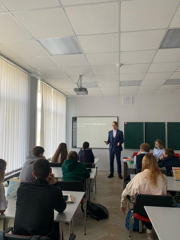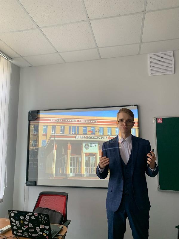 Педагог дополнительного образования Отрадненской школы Лада Трубачева реализует проект «Университет – Отрадненской школе», в котором приглашает студентов, преподавателей, научных деятелей из ВГУ на встречи со школьниками. Одним из первых гостей, с которым встретились ученики 9–11 классов, стал студент 2-го курса факультета ПММ Василий Швыров. Он рассказал о себе, своём поступлении в университет, о хобби и проектной деятельности.