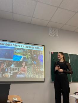 На встрече Елена рассказала ученикам о своём факультете, о плюсах, которые предоставляет ВГУ спортсменам и активным студентам. Студентка рассказала о программе обмена и возможностях участия в ней.