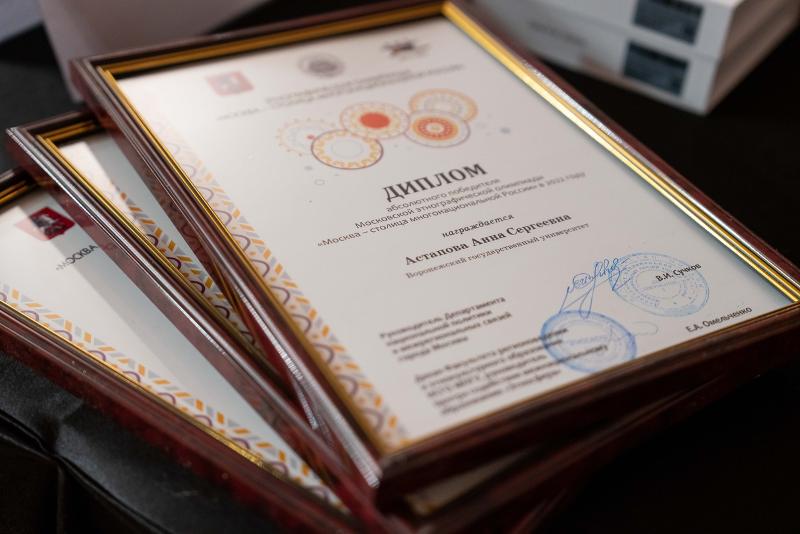 Среди победителей московской этнографической олимпиады – будущие педагоги, филологи, историки, географы, культурологи, лингвисты, юристы, политологи, хореографы, инженеры. Партнёром проекта в этом году выступил крупнейший в стране Этнографический парк-музей «Этномир». С ответным словом к организаторам проекта на итоговом мероприятии выступили три «абсолютных победителя» этноолимпиады – студентки Воронежского и Петрозаводского государственных университетов – Анна Астапова (ВГУ), Карина Лёвина и Софья Герасимова (ПетрГУ), которые набрали наивысший балл среди всех вузов-участников.
