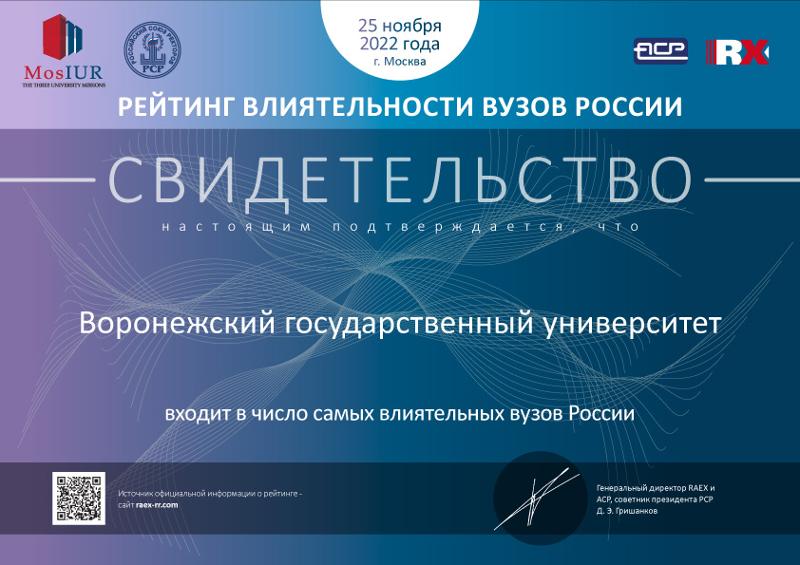 Рейтинговое агентство RAEX опубликовало список самых влиятельных российских вузов по версии «РАЭКС-Аналитики». По итогам рейтинга влиятельности вузов России в 2022 году Воронежский государственный университет занял 55-е место. Предыдущий рейтинг был опубликован в 2020 году.