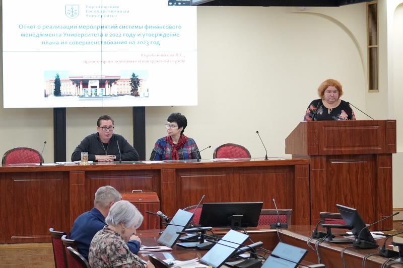В программу основной части заседания вошли доклады проректора по экономике и контрактной службе Ларисы Коробейниковой и проректора по эксплуатации зданий и капитальному строительству ВГУ Николая Брянцева. Лариса Сергеевна предоставила традиционный отчёт по проектам сферы финансового менеджмента, составленный на основе показателей Министерства науки и высшего образования.