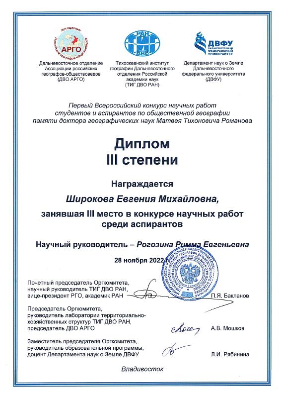 Осенью 2022 года состоялся первый Всероссийский конкурс научных работ студентов и аспирантов по общественной географии памяти доктора географических наук Матвея Романова. Призёром конкурса стала аспирантка кафедры социально-экономической географии и регионоведения ГГиТ ВГУ Евгения Широкова. Аспирантка представила работу на тему «Оценка историко-культурного потенциала Орловской области: проблемы и перспективы развития» (научный руководитель – заведующая кафедрой СЭГиР ВГУ, кандидат географических наук, доцент Римма Рогозина). Организатором конкурса выступил Тихоокеанский институт географии ДВО РАН совместно с Дальневосточным отделением Ассоциации российских географов-обществоведов и Департаментом наук о Земле Дальневосточного федерального университета.
