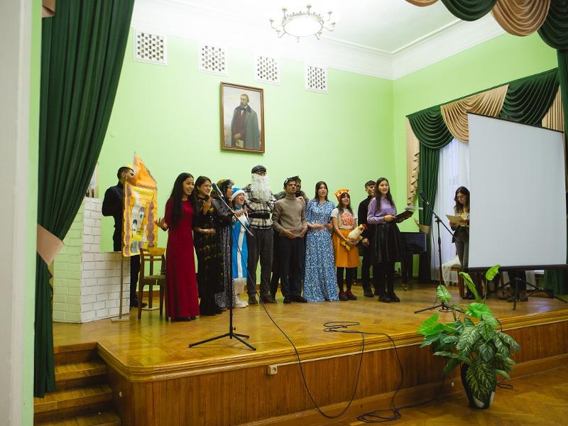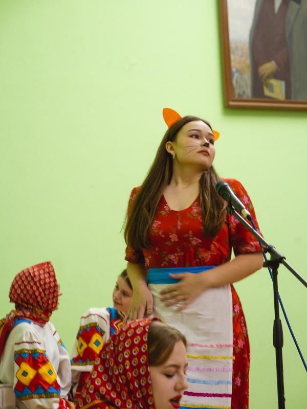 Праздничный концерт был представлен номерами студентов филологического факультета, подготовивших сценки по мотивам сказок В.И. Даля. Своё выступление подготовили и студенты-иностранцы, обучающиеся на факультете – как всегда, их выступление было встречено бурными аплодисментами зрителей.