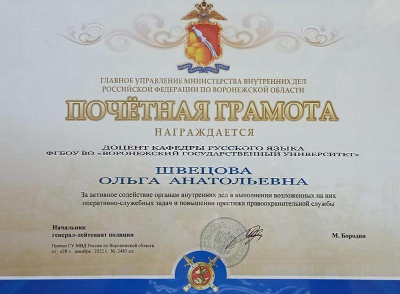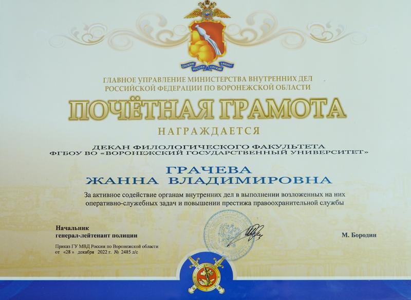 Сотрудников филологического факультета ВГУ наградили почётными грамотами от ГУ МВД по Воронежской области. Награды от генерала-лейтенанта Михаила Бородина получили декан факультета Жанна Грачёва и доцент кафедры русского языка Ольга Швецова.