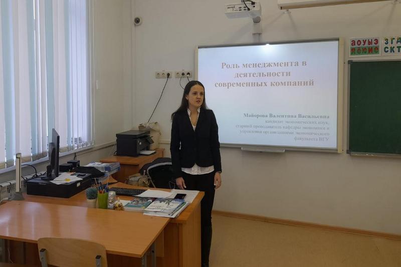 8 февраля прошла встреча преподавателя кафедры экономики и управления организациями экономического факультета, кандидата экономических наук Валентины Майоровой с учениками 11 «Б» класса школы № 101. Лектор рассказала школьникам о научной деятельности, анонсировала 37-ую конференцию Научного общества учащихся, которая состоится в ВГУ 2 апреля. Также Валентина Майорова прочитала лекцию на тему «Роль менеджмента в деятельности современных компаний». После лекции состоялось обсуждение практических примеров, школьники задали много интересных вопросов.