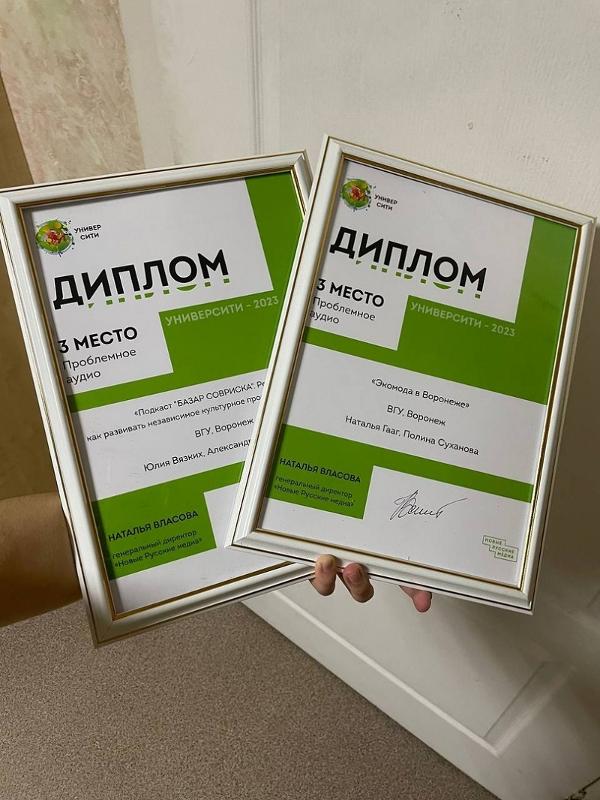 В номинации «Проблемно-аналитическое аудио» 3-е место заняли проект студентки Полины Сухановой и старшего преподавателя кафедры электронных СМИ и речевой коммуникации Натальи Гааг «Экомода в Воронеже» и подкаст «БАЗАР СОВРИСКА (Револьт-центр: как развивать независимое культурное пространство в регионе)» студенток Юлии Вязких и Александры Тарарыковой.