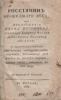 Один из докладов был посвящён книге, вышедшей в петровское время. Это труд И.Т. Посошкова «Россиянин прошедшего века…» (Москва, 1793). Её автор – Иван Тихонович Посошков (1652–1726) – первый русский экономист-теоретик, мыслитель, публицист, предприниматель и изобретатель. Многие его мысли опередили своё время. Известный историк М.П. Погодин писал: «…Многие важные политические меры, которыми прославились царствования Екатерины II и Александра II, были предложены уже Посошковым».