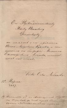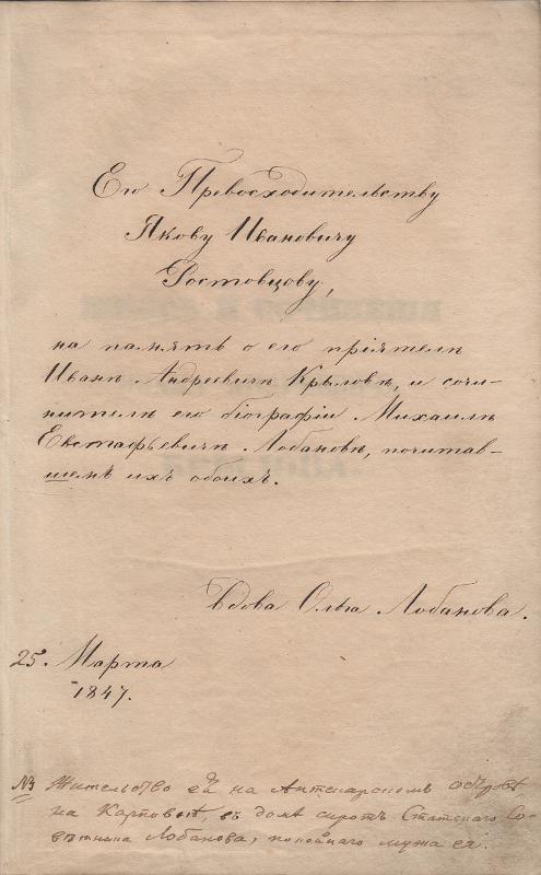 Был представлен также труд академика М.Е. Лобанова о жизни и сочинениях Ивана Андреевича Крылова (Петербург, 1847) с дарственной надписью вдовы автора Я.И. Ростовцеву (1847). Михаил Евстафьевич Лобанов (1787–1846) – автор первой книги об И.А. Крылове – российский поэт и переводчик, в труде о баснописце впервые приводит некоторые его ранние опыты в драматическом жанре и разнообразные бытовые подробности.