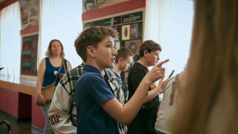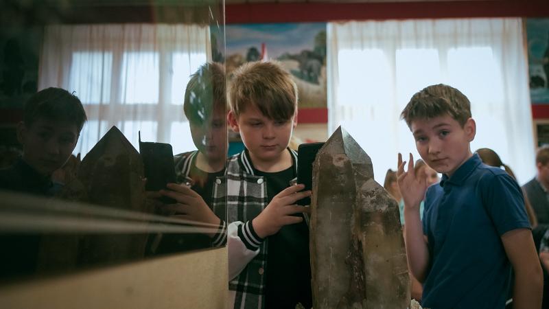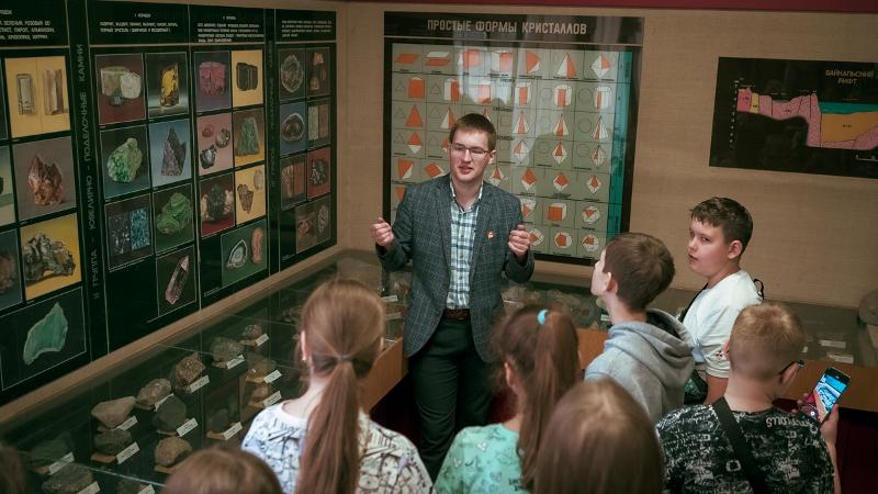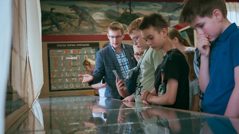 Магистрант 1-го курса геологического факультета Илья Макарихин увлечённо рассказал о профессии геолога и познакомил школьников с коллекцией горных пород в Геологическом музее. Экспонаты музея вызвали у школьников большой интерес.