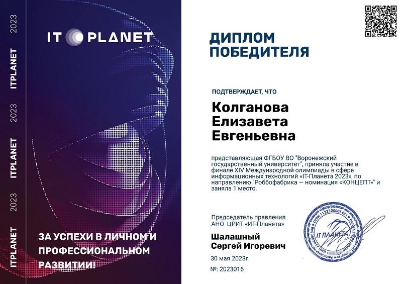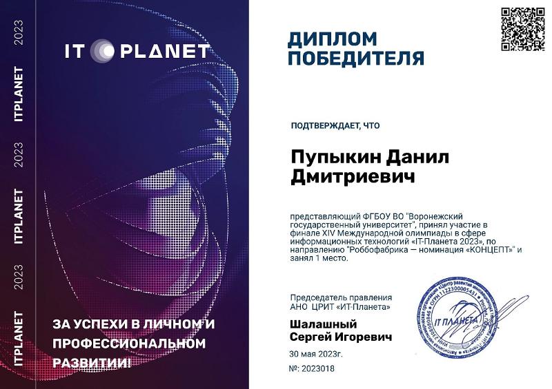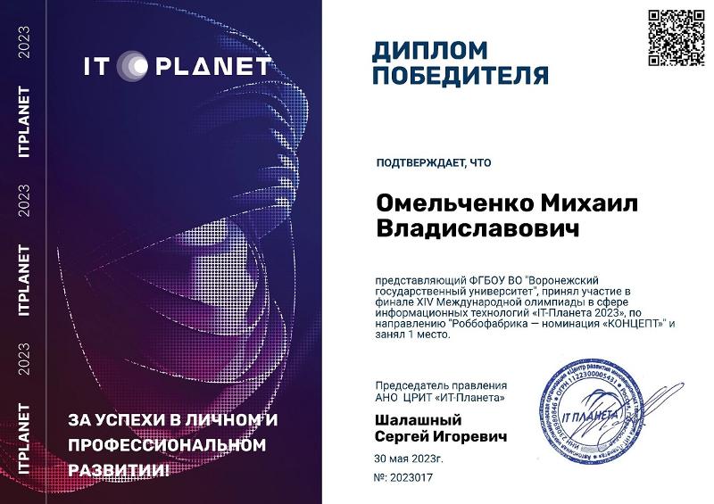 Студенты факультета прикладной математики, информатики и механики ВГУ Елизавета Колганова (2 курс), Михаил Омельченко (2 курс), Данил Пупыкин (1 курс) и Александр Баклашов (1 курс магистратуры) приняли участие в Международной олимпиаде в сфере информационных технологий «IT-Планета 2023». Команда студентов факультета ПММ стала победительницей олимпиады, заняв 1-е место.