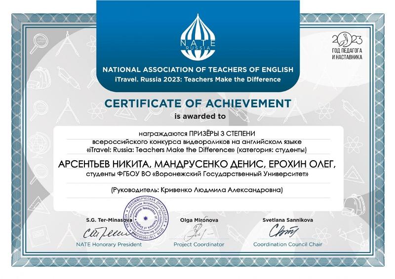 Студенты 2 курса факультета ПММ Никита Арсентьев, Денис Мандрусенко и Олег Ерохин заняли 3-е место во Всероссийском конкурсе видеороликов на английском языке «iTravel.Russia. Teachers Make the Difference».