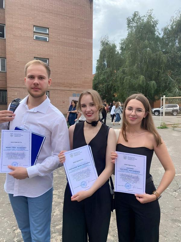Выпускники направления «Зарубежное регионоведение» ФМО Мария Игнатова, Дарья Ковалева, Мария Колтунова, Полина Матюшина, Анастасия Тонких, Глеб Чалин получили благодарности ректора ВГУ за использование профессиональных экспертно-аналитических компетенций в научно-просветительском межфакультетском проекте ВГУ «Афроевразийская одиссея русского учёного, физика Н.Г. Нифонтова», а Анастасия Карпова, Владлена Кудряшова и Валерия Черткова – за активное участие в семинаре 7 июня 2023 года. Дипломы ребята получили вместе с дипломами бакалавра.