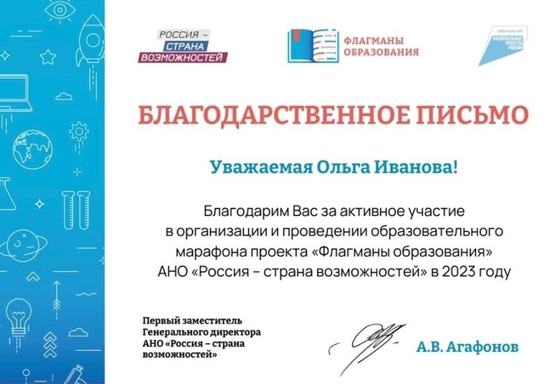 За постоянную просветительскую деятельность Ольгу Иванову отметили благодарственным письмом от АНО «Россия – страна возможностей».