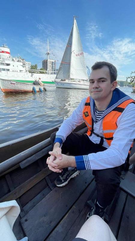 «Будучи уже практически дипломированными бакалаврами, мы получили предложение от нашего преподавателя поехать в Калининград на Морской фестиваль “Водная ассамблея”. Вообще-то в путешествие должны были отправиться четыре студента 4-го курса и столько – же 3-го. Но сессия, практика, сдача госэкзамена, защита дипломов, их вручение, поступление в магистратуру некоторых подкосило… До Калининграда смогли доехать лишь двое. Конечно же, сразу возник вопрос: “А гребли ли мы когда-либо в своей жизни?”. Нет! Но пришлось сесть в лодку и взять вёсла в руки. Чувствовали ли мы себя лишними на этом маленьком историческом судне? Возможно. Вроде и весло правильно вставлено, а грести правильно не получается. Но мы быстро разобрались, и дальше стало немного проще. На самом деле было здорово! Во-первых, когда бы ещё нам посчастливилось управлять такой лодкой? А во-вторых, у нас были самые роскошные места, чтобы смотреть на все водные выступления фестиваля!»