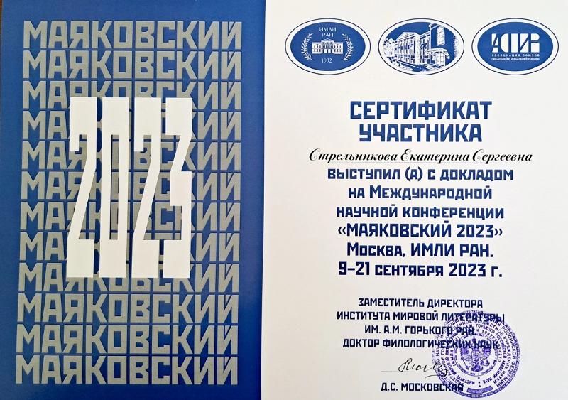 19–21 сентября преподаватель кафедры русской литературы XX и XXI веков, теории литературы и гуманитарных наук Екатерина Стрельникова принимала участие в работе Международной научной конференции «Маяковский 2023» (г. Москва), приуроченной к 130-летию со дня рождения поэта.