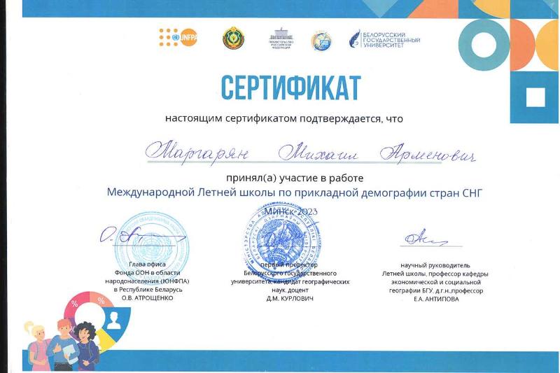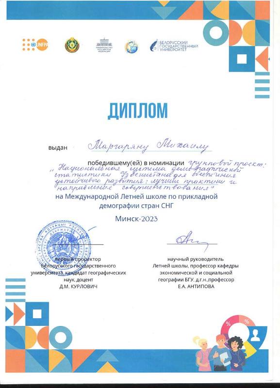По результатам летней школы Михаилу Маргаряну выдали сертификат участника, а также вручили дипломы за работу в групповых проектах в номинациях: «ГИС-технологии в прикладной демографии», «Влияние изменений и дополнений в социально-экономическую политику Узбекистана с учётом демографического фактора», «Национальная система демографической статистики Узбекистана для обеспечения устойчивого развития: лучшие практики и направления совершенствования».