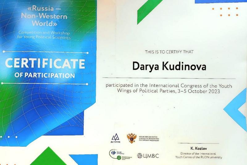 С 3 по 5 октября прошёл международный конкурс-практикум молодых политологов «Россия – незападный мир». В мероприятии приняла участие студентка третьего курса факультета международных отношений ВГУ Дарья Кудинова. Конкурс-практикум состоялся на площадке РАНХиГС в Москве по инициативе Министерства науки и высшего образования Российской Федерации совместно с Международным молодёжным центром Российского университета дружбы народов имени Патриса Лумумбы и платформой молодых политологов «Дигория».