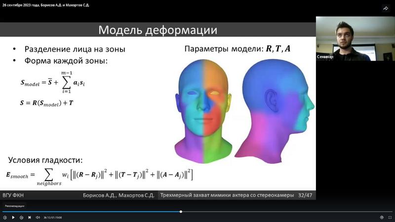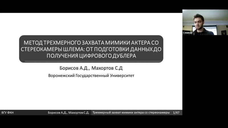 В своём докладе Александр Борисов рассказал о разрабатываемой им диссертационной тематике – методе трёхмерного видеозахвата мимики актёра со стереокамеры шлема оператора. По окончании выступления состоялась дискуссия, в которой авторы доклада и участники семинара обменялись полезными мнениями.